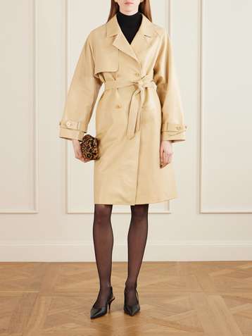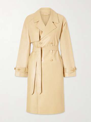 Double-breasted belted leather trench coat