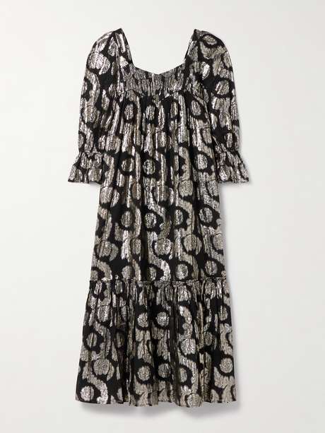 Alix of Bohemia’s ‘Lilium’ dress is made from cotton amd woven with rows of shimmering Lurex flowers throughout. It has subtly puffed shoulders and a loose, flowy shape that drapes effortlessly over your frame. Accessorize with sandals and colorful jewelry.