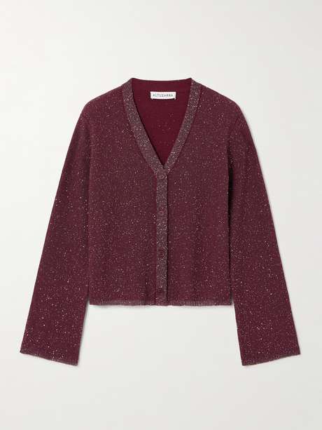 Flecks of metallic threads lend glamorous sparkle to Altuzarra's 'Taylor' cardigan. In a festive burgundy shade, it has a relaxed shape with a classic V-neckline and ribbed trims. Wear yours solo as a top.