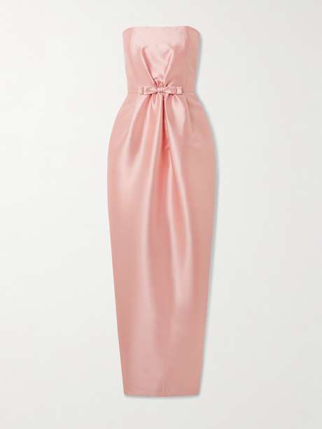 BERNADETTE's 'Lenette' gown gathers delicately at the waist - the silhouette evokes '50s Hollywood starlets. It's made from lustrous, structured taffeta with boning through the bodice, and is tipped with a matching bow.