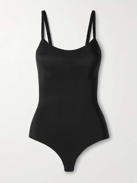 Commando's bodysuit is designed with a compressive panel along the midsection that smooths and sculpts your figure. Cut from four-way stretch-jersey, it has crisscrossing, adjustable straps and an undetectable thong base.