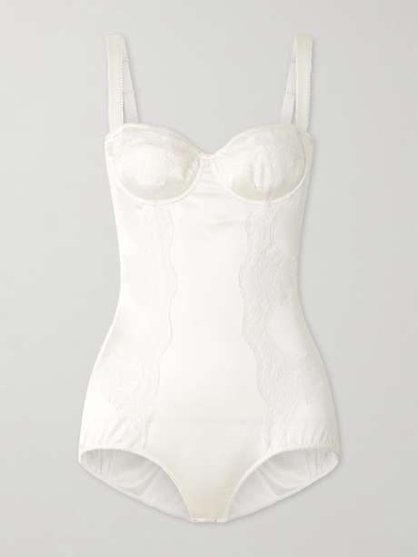 Dolce&Gabbana's bodysuit has low-cut legs and underwired balconette cups reminiscent of lingerie from the '50s. It's been made in Italy from white silk-blend satin with delicate lace trims and a little boning for structure. Adjust the straps to your preferred fit.