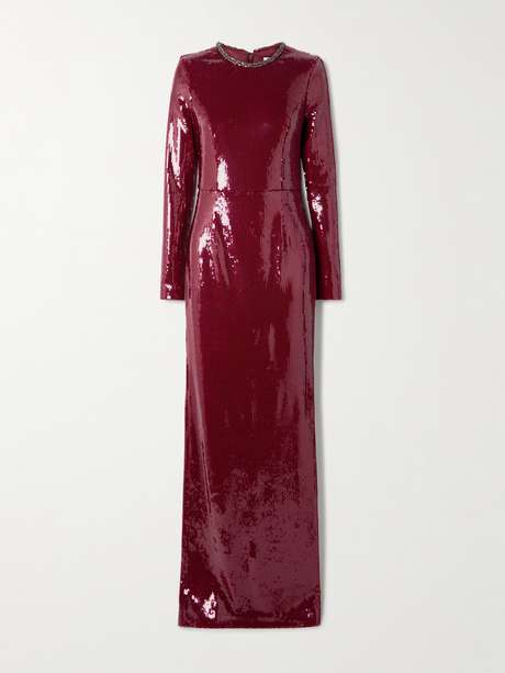 Rebecca Vallance's 'Nero' gown is covered in scores of tonal burgundy sequins - perfect for making an eye-catching entrance at your next event. Cut to skim the figure from stretch-mesh, it's embellished with sparkling crystals along the round neckline, so you can forgo a necklace.