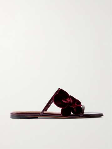 Orchid appliquéd velvet-trimmed glossed-leather slides
