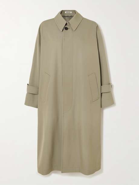 Auralee's collections can be described as "timeless yet rooted in the moment." Central to this design philosophy is this wrinkle-resistant trench coat, made from wool-gabardine and finished with a water-repellent coating. The relaxed fit is enhanced by wide cuffs and slanted pockets.