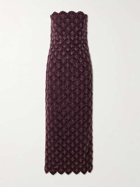 EXCLUSIVE AT NET-A-PORTER. Clio Peppiatt's 'Ariel' gown is intricately hand-embroidered with beads and crystals to depict seashells. Made from rich plum satin, it has an elegant column silhouette with a strapless neckline and scalloped edges. Keep accessories simple to allow the incredible handiwork to really shine.