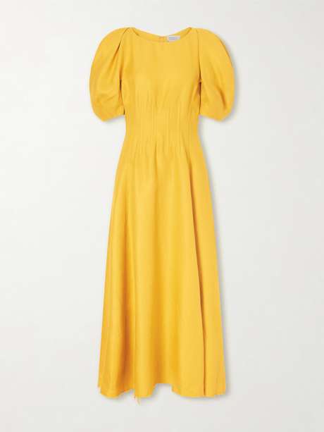 Mustard yellow was a standout color in Gabriela Hearst's Spring '26 collection. Made from breathable linen, the 'Ranya' dress has puffed sleeves that create a sculptural silhouette and a frayed hem. Boning through the bodice defines the hourglass shape.