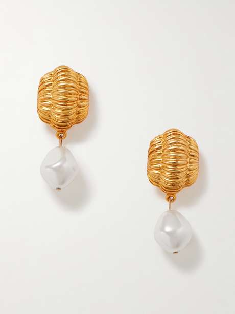 Jennifer Behr's 'Asha' earrings are modeled on a vintage pair from the '60s. Handmade in New York City from gold-plated metal, they're carved for a ribbed texture and anchored by lustrous faux pearl drops.