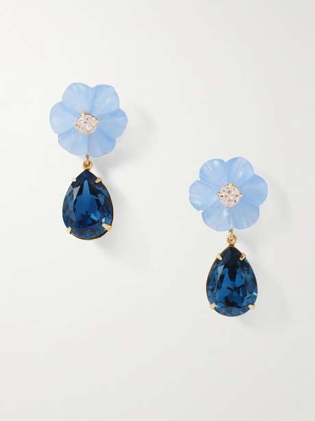 Jennifer Behr's jewelry is informed by the designer's studies in sculpture and art history. Crafted in Brooklyn from gold-plated brass, these 'Juna' earrings feature hand-carved chalcedony flowers centered by crystals to match the light-catching drops. They frame the face so beautifully.
