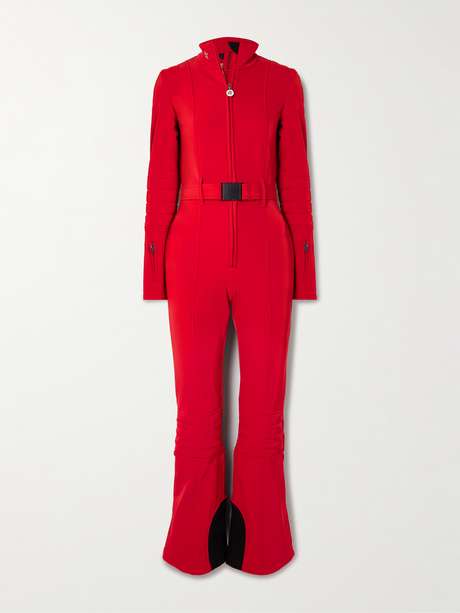 Perfect Moment's 'JG' ski suit is made from the label's four-way stretch-shell that's water-resistant and quick-drying, and has a soft fleece lining to keep you warm. Designed to contour your frame, it has a high neckline, belted waist and flared legs, which make it easy to adjust your boots.