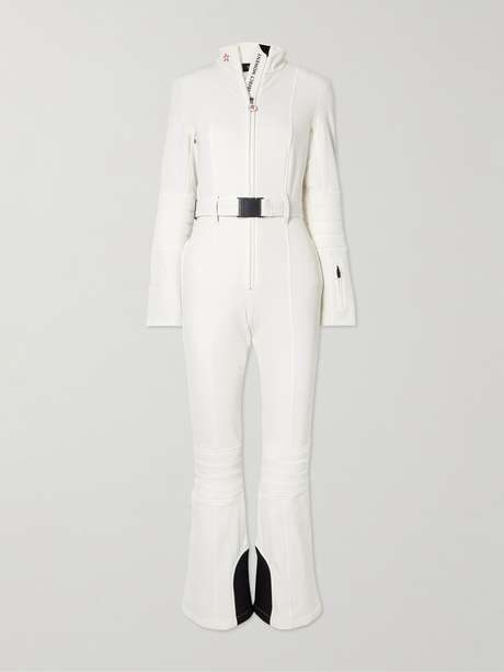 Perfect Moment's 'JG' ski suit is made from the label's four-way stretch-shell that's water-resistant and quick-drying, and has a soft fleece lining to keep you warm. Designed to contour your frame, it has a high neckline, belted waist and flared legs, which make it easy to adjust your boots.