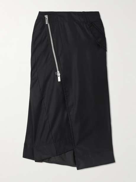 Sacai's midi skirt has a wrap-effect front accentuated by an exposed, asymmetric two-way zip. Made from panels of glossy shell, it has a godet-pleated back and buckled tab at the waist. We like it styled with a plain tee and sneakers.