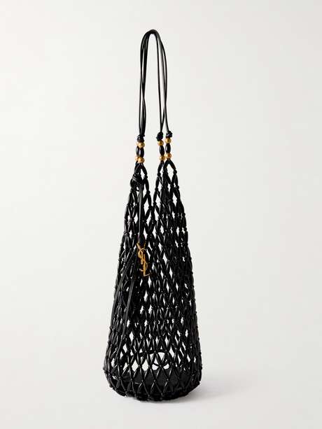SAINT LAURENT's tote is made from strips of leather that are strung with an array of black and gold-tone beads, creating the illusion of a macramé style. It has a completely open construction with a structured base and features the logo plaque. There's enough space inside for a book, bottle and cosmetics pouch - plus, the attached zipped compartment keeps cards secure.