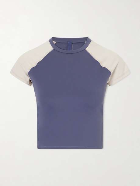 SKIMS and Nike combine performance innovation with the brand’s sculpting focus. Made from a mix of matte and shine stretch jerseys, this tee is cut for a body-hugging fit with colour-blocked raglan sleeves that enhance mobility, while the cropped length keeps the silhouette streamlined.