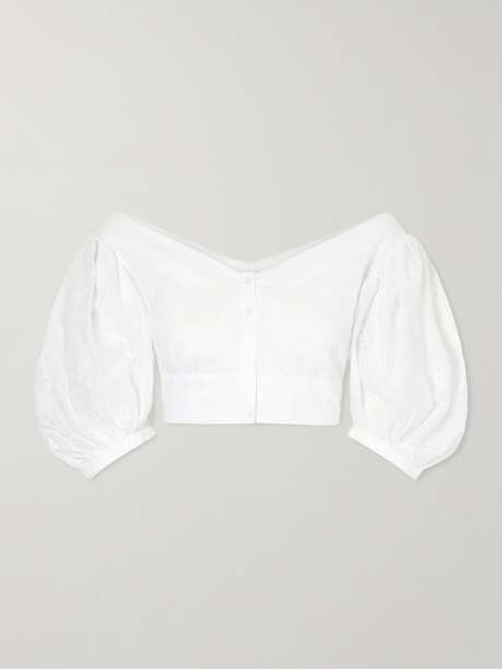 Thierry Colson’s ‘Clara’ blouse takes inspiration from Victorian undergarments. Cut from airy cotton voile traced with French knot embroidery, it’s shaped with an off-the-shoulder neckline and billowy sleeves, framed by delicate crochet trims.