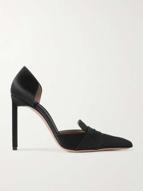 TOM FORD's 'Eva D'Orsay' pumps were seen on the Fall '25 runway. Made from smooth satin, they have loafer-style vamps, slender pointed toes and 105mm stiletto heels.