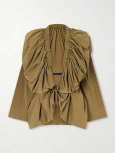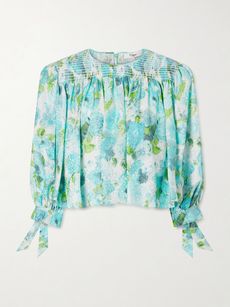 With a plethora of options to choose from, the question is: where to start? There’s something innately feminine about a blouse, so it makes sense to head to the houses who have that in their DNA. First up is Chloé. With a delightfully whimsical leaning, the French brand balanced pretty with punchy on the runway, presenting pieces like this floral-print silk-jacquard blouse. Cropped and smocked, it delivers Riviera style in droves and is guaranteed to become a mainstay of your warm-weather wardrobe, whether you pair it with the matching bikini bottoms or cropped jeans and slides. Khaite’s appliquéd design is in a similar vein, gently structured, with ethereal appeal.