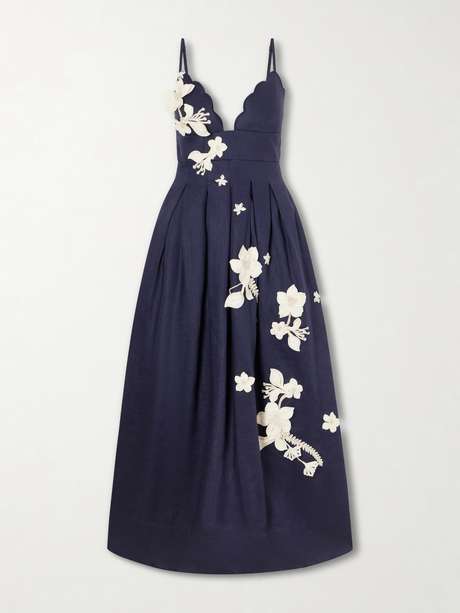 A study in placement and movement, Agua by Agua Bendita's 'Sula Cauca' is crafted from structured linen, where a plunging neckline meets a defined waist. Hand-embroidered floral appliqués trace the silhouette asymmetrically, unfolding across the surface with quiet dimension while the skirt falls in a controlled line.