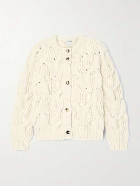 Bottega Veneta's cardigan has been made in Italy from naturally insulating wool. It's knitted with chunky cables and ribs in a slightly cropped shape. Style yours as a top, leaving it buttoned-up to the crew neck or open it to reveal your favorite simple T-shirt underneath.