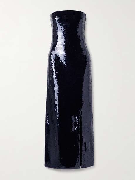 Bottega Veneta's dress is saturated in midnight-blue sequins, creating a cool, liquid-like shine. Cut from recycled-tulle, it has a strapless neckline and figure-skimming column silhouette.