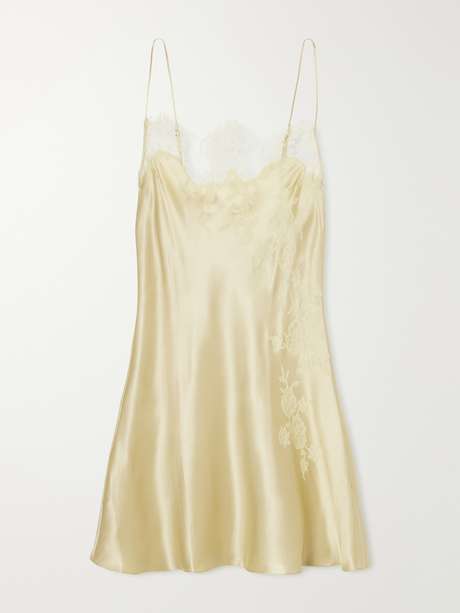 Carine Gilson’s slip is crafted from pure silk with delicate lace detailing, shaped to a babydoll silhouette. The straight neckline balances the fluid drape, while the lace adds a soft, romantic contrast.