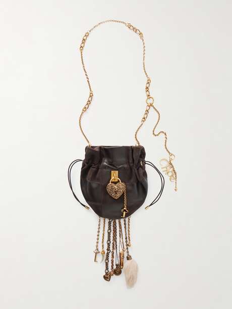 Chloé’s bag debuted in the opening look of the label’s Fall ’25 show, where it set the tone for a collection rich in detail and lavishly adorned throughout. It's made from leather and suede in a patchwork design and has gold-tone hardware and embellishments, including a heart-shaped padlock and chain fringe tipped with different talismans. There's just room for a phone, keys and lipstick.