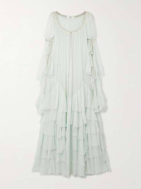 As seen on Chloé's Victorian-inspired Fall '25 runway, this gown is cut from gathered organic silk-mousseline. It's threaded with ties along the lace-trimmed neckline and sleeves and falls to a voluminous ruffled tiered skirt. Underpin yours with a tonal slip for coverage or lingerie to capture the show's ethereal vibe.