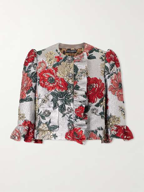 Dolce&Gabbana’s jacket is richly woven with florals that bloom across its lustrous surface. Cut from jacquard-lamé, it has a cropped silhouette with ruffled cuffs and a structured finish.
