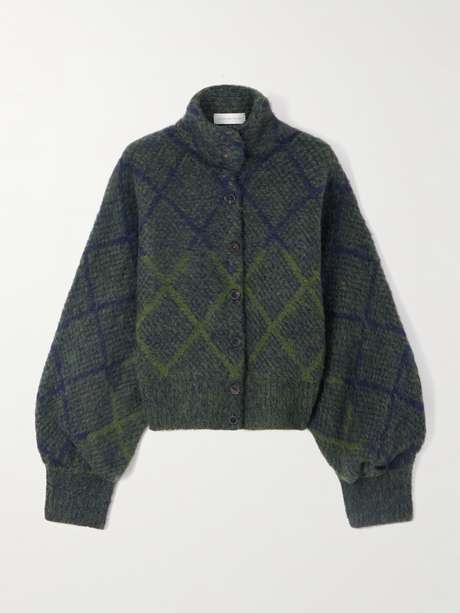 Dries Van Noten's cardigan is knitted from a soft alpaca-blend patterned with diamond-shaped checks. It has voluminous sleeves and a contemporary turtleneck.