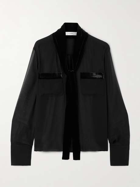 FRAME's blouse is timelessly elegant. Cut from slightly sheer silk-chiffon, it's trimmed with plush black velvet and has long ties that can be fastened into a bow to complement the V-neckline. Underpin yours with a tonal bralette or tank.