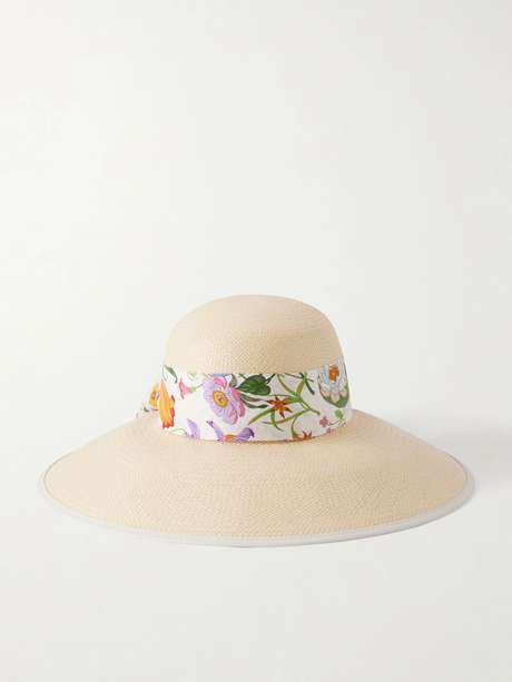 GUCCI Beverlie floral-print silk and leather-trimmed straw hat