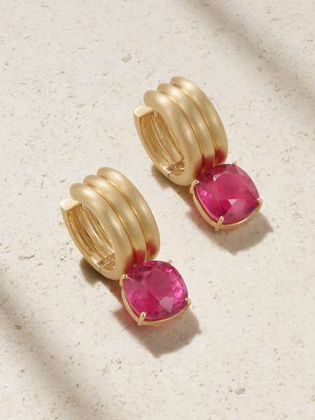 Irene Neuwirth's 'Heroic' collection combines bold, architectural silhouettes with luminous stones. Part of the range, these earrings are handmade from 18-karat gold and have a stacked hoop shape anchored by 13.22-carats of one-of-a-kind rubellite.