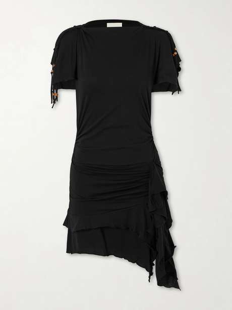 Isabel Marant puts a bohemian twist on the little black dress. Made from cotton-jersey, it has braided detailing along the sleeves finished with beads and a ruched asymmetric mini skirt. Style it with boots.