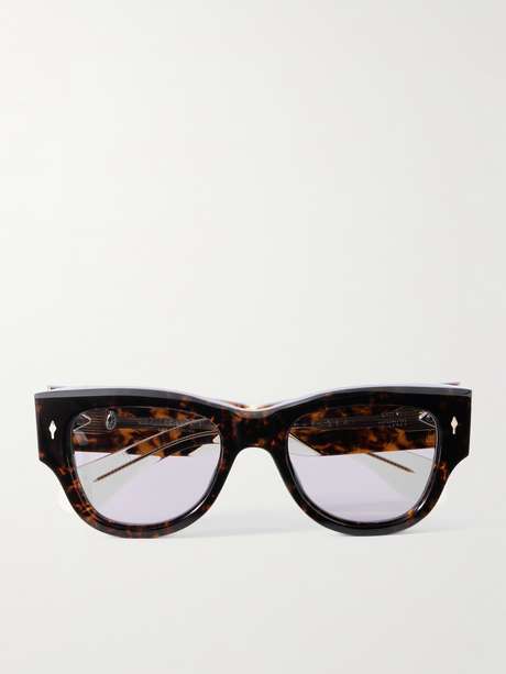 Jacques Marie Mage's 'Chelsea' sunglasses have sculpted frames that recall vintage Panto styles. Handcrafted in Japan in a limited batch of 450, they're made from glossy acetate and set with anti-reflective lenses. The oversized temples are tipped with signature arrowhead pins and a trio of stars on the arms.