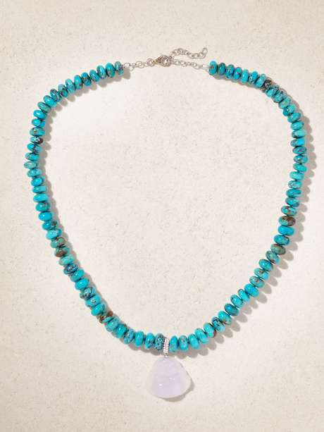 JIA JIA's necklace is strung with a jade Buddha pendant that symbolizes joy and peace. Handmade from 14-karat gold, it's threaded with vibrant turquoise beads and sparkles with pavé diamonds.