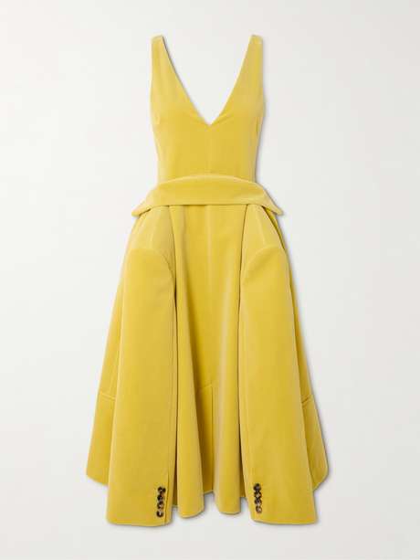 JW Anderson's dress is designed to look as though there is a tonal blazer attached. It's been made in Italy from plush cotton-velvet in a vibrant yellow and has a padded collar, as well as sleeves with buttoned cuffs and welt pockets adorning the midi skirt. The V-neckline frames your décolletage nicely.