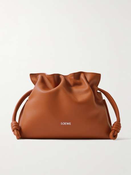 Loewe's slouchy 'Flamenco' clutch is one of the bags to own this season, and we especially like this scaled-down mini version. Crafted in Spain from supple camel leather and lined in suede, it's topped with knotted drawstring ties and foiled with the label's logo. Attach the optional strap to go hands-free and stow your phone and wallet inside.