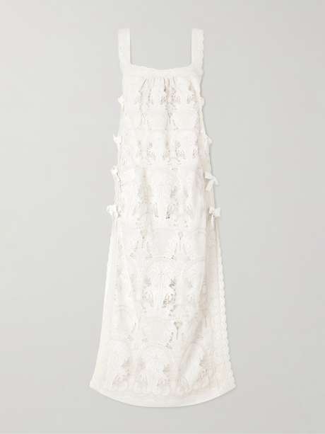 Rooted in Florentine craftsmanship, Loretta Caponi approaches dressmaking through a couture lens, where embroidery and fabric become heirloom elements. The ‘Fiocchini’ dress is cut from lace-trimmed cotton with broderie anglaise panels, fastening with delicate bows at the side that add a soft finish.