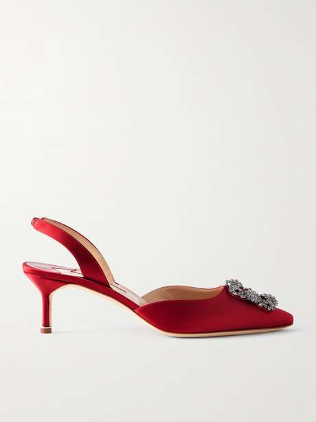 Manolo Blahnik has been the sole designer of his eponymous label since its conception in the '70s - he still sketches each by hand using watercolor ink, so they truly look like works of art. Made in Italy from red satin, these 'Hangisli' pumps have pointed toes topped with signature crystal-embellished buckles and partially elasticated slingback straps.