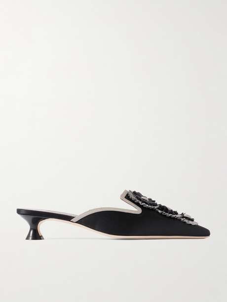 EXCLUSIVE AT NET-A-PORTER. Manolo Blahnik deep-dived into the V&A archives to design these 'Merode' mules, inspired by styles worn by Marie Antoinette. They're made from satin with grosgrain trims, dainty rosette appliqués and kitten-height Louis heels.