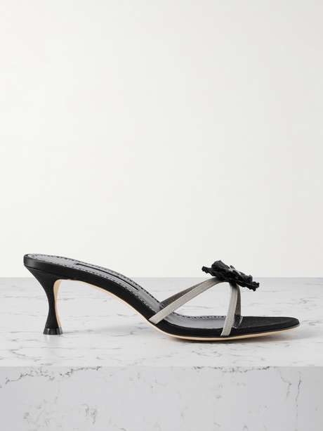 EXCLUSIVE AT NET-A-PORTER. Manolo Blahnik's 'Marie Antoinette' capsule puts a vibrant spin on Rococo style, echoing the designer's creations for Sofia Coppola's beloved film. These 'Paliss' sandals are made from grosgrain with floral appliqués on the slim straps and fluted heels that offer just a little lift. Show yours off with cropped hemlines.