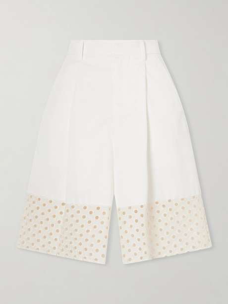 Marni’s shorts juxtapose crisp tailoring with a delicate feel. Made from cotton-gabardine, they’re pleated through the front and fall to wide legs with a tonal broderie anglaise hem.