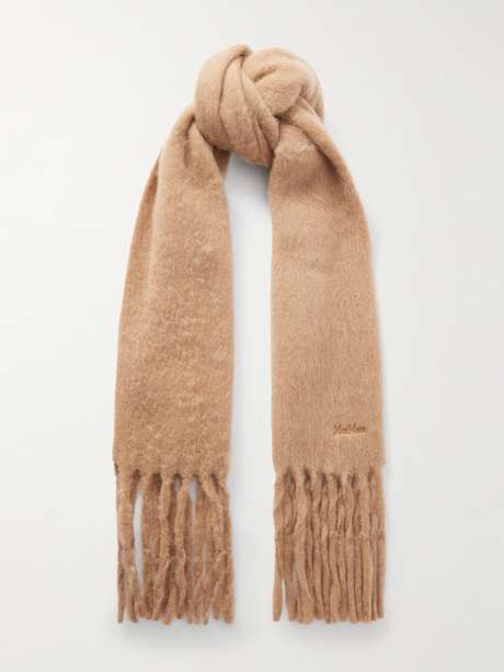 Max Mara’s scarf is made from an incredibly soft and cozy alpaca-blend in a versatile brown shade that goes with nearly any outwear. It has an enveloping shape with fringed edges.
