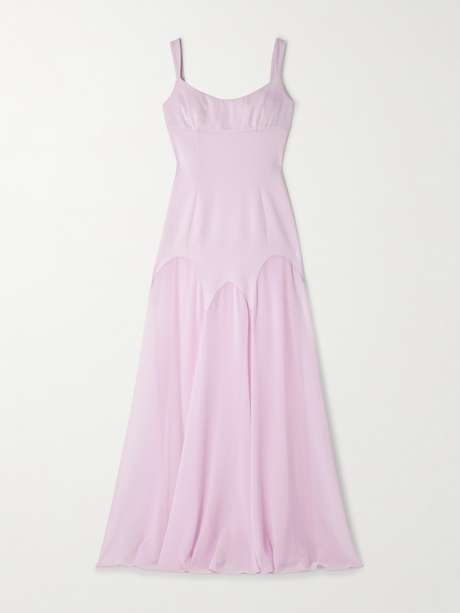 McQueen's dress is made from panels of lustrous satin-crepe that meet at scalloped seams along the dropped waist. It's designed for a slim fit with a defined bust and a darted bodice. The floaty hem moves beautifully as you walk.