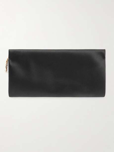 SAINT LAURENT's clutch is made from lustrous satin in a classic black. It has a slim, elongated shape and is detailed simply with the label's moniker and gold-tone 'Cassandre' charm. Inside, there's enough room for your keys, lipstick and compact while the leather slip pocket can fit your most-used cards.