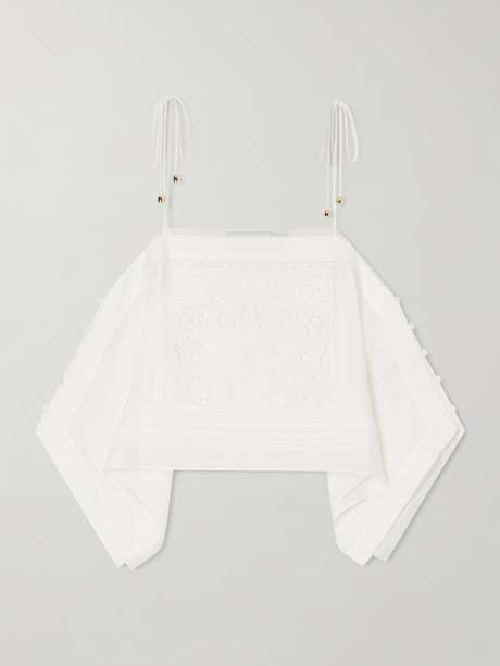 Self-Portrait’s top captures the ease of sun-drenched days. Draped from airy ramie, it falls from slender tie-fastening straps into a flowy silhouette, intricately embroidered with delicate motifs throughout.