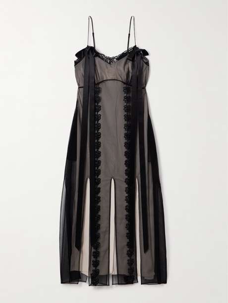 Simone Rocha's Fall '25 runway was set in London on an overcast day, foreshadowing the grunge-infused collection. Drawing inspiration from elegant nightwear, this dress has a crepe de chine under slip and sheer chiffon overlay. The sweetheart neckline is decorated with lace and long ribbon bows.