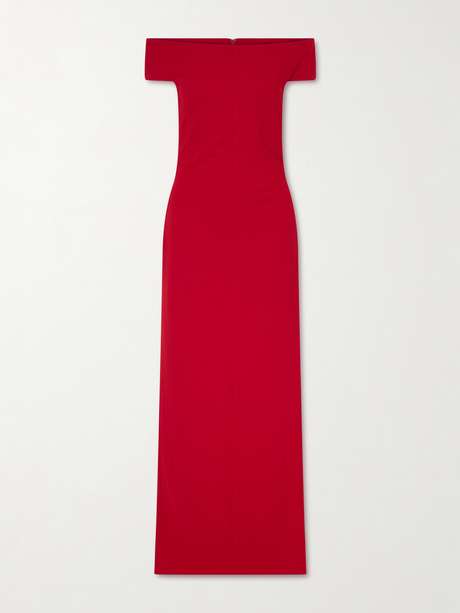 Solace London is renowned for sculptural silhouettes and refined, modern eveningwear. The 'Kyra' maxi dress features a fitted bodice with an elegant off-the-shoulder neckline that beautifully frames the décolletage. Flowing into a floor-length skirt, it creates a streamlined, elongated silhouette that balances structure with fluidity.