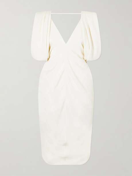 Versace’s cocktail dress debuted on the runway and is crafted from fluid crepe marocain. Designed with a deep V-neckline and softly draped silhouette, it falls to an asymmetric hem that moves elegantly with every step. Style yours with heels and a compact clutch.