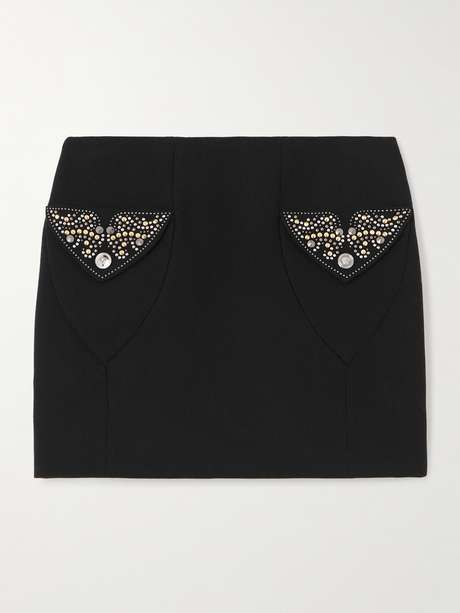 Versace's low-rise mini skirt debuted on the Fall '25 runway as a set with the matching jacket. It's made from wool-crepe and accented with 'Medusa' medallions and gold- and silver-tone studs at the pockets.